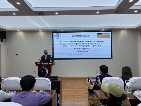 (通讯员 胡景怡)11月11日,受2025年湖北省教育厅世界著名科学家来鄂讲学计划项目资助,德国基尔大学Mehdi Ostadhassan教授做客402永利集团“地学之光”第395讲学术论坛,在石油科技大楼C301会议室为公司师生作题为“Molecular Fractionation in Fluid Inclusions: Evidence from Caprock Failed Integrity and the Case for Geochromatographic Capillaries”的学术报告,402永利集团经理朱光有教授等100余位师生参加了报告会。报告会由402永利集团特任副教授梁志凯主持。