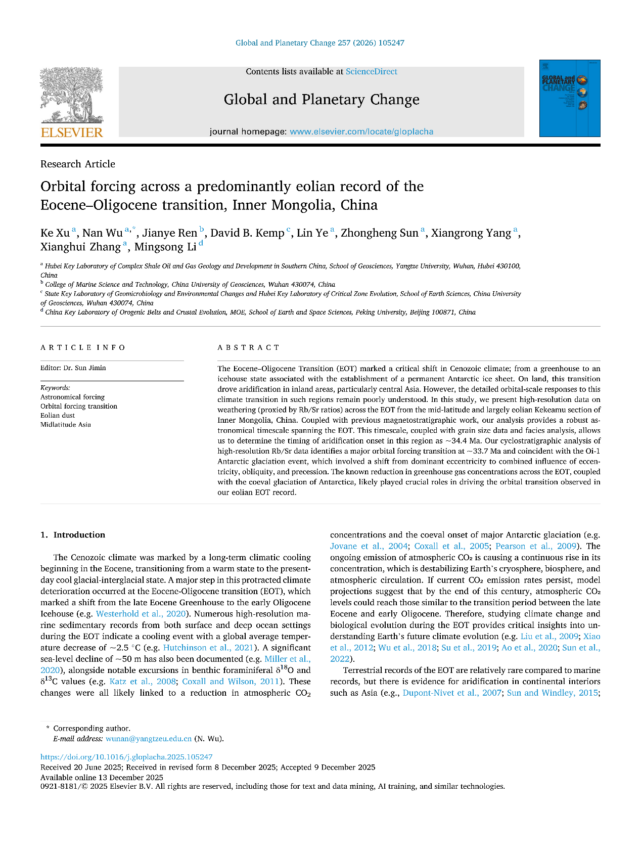 (通讯员 杨向荣)402永利集团石油系教师许可在中科院一区TOP期刊《Global and Planetary Change》上发表题为“Orbital forcing across a predominantly eolian record of the Eocene–Oligocene transition, Inner Mongolia, China”的论文,402永利集团南方复杂页岩油气地质与开发湖北省重点实验室为论文第一署名单位,许可博士为第一作者,吴楠教授为唯一通讯作者,研究获得国家自然科学基金和新型油气勘探开发国家科技重大专项联合资助。