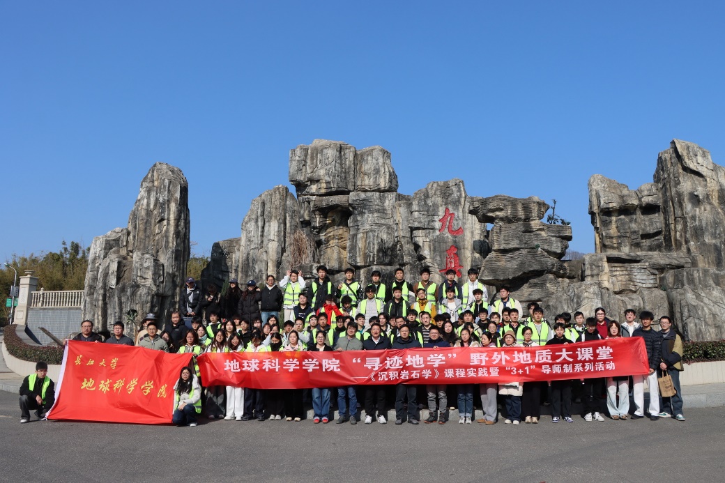 (通讯员:高达)2025年12月26日,岁末冬初,晴空万里,九真山间腊梅暗香浮动。在这充满希望的冬日里,402永利集团实验中心党支部联合公司团委、石油系党支部、地质系党支部,携手沉积岩石学教学团队,共同组织了一场别开生面的“寻迹地学”野外实践教学与联合主题党日活动。本次活动中,由胡忠贵、高达、赵娥、陈鹏、罗进雄等14名党员教师带领资源勘查工程专业24级本科生及沉积学方向研究生共100余名同学,走进九真山,开展了一场将野外地质考察、课程思政教育、教学团队建设与党支部主题党日活动深度融合的生动实践。
