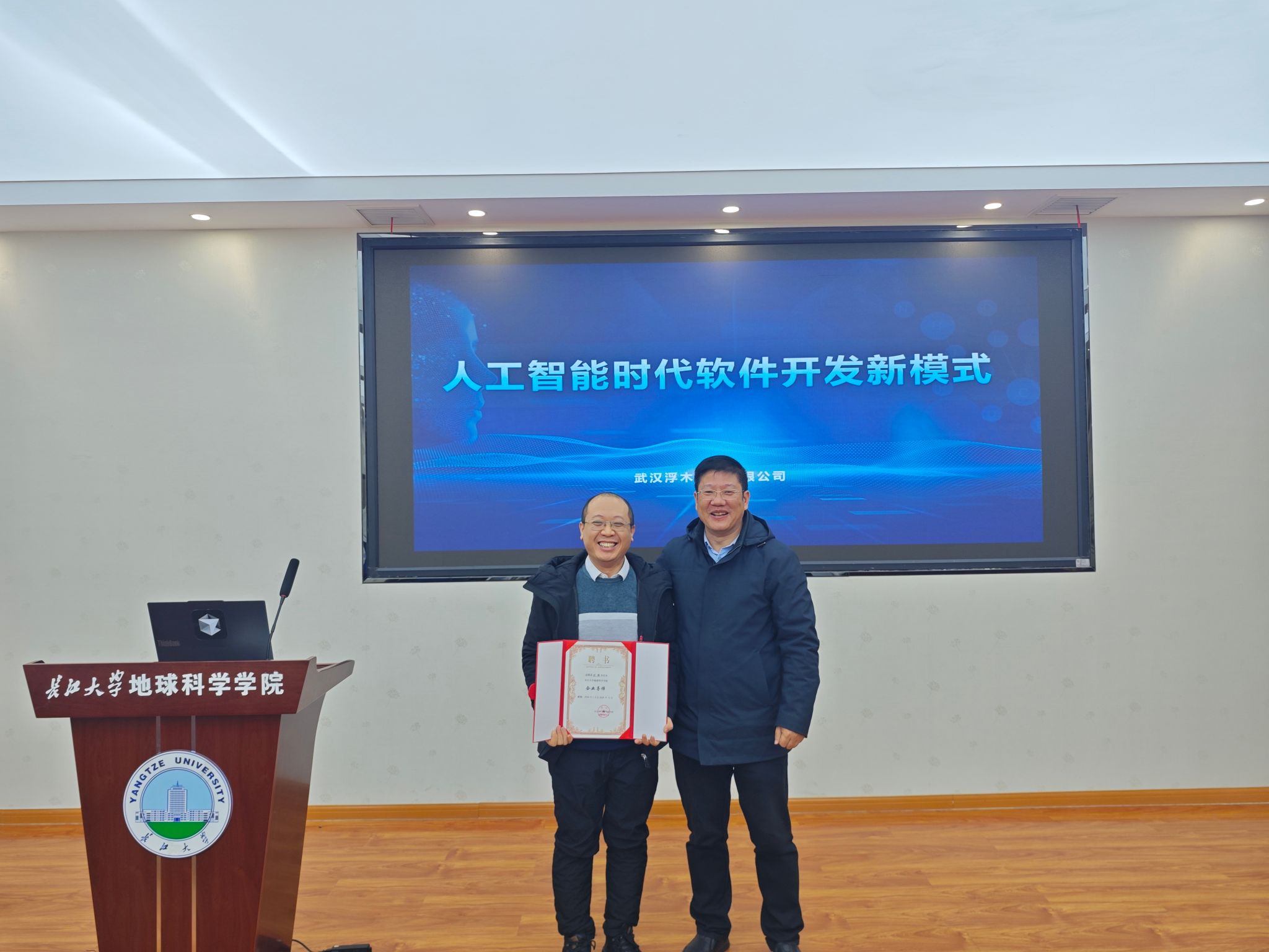 会议伊始,举行了企业导师聘任仪式。胡忠贵副经理代表公司向武汉浮木科技有限公司技术专家颁发聘书,旨在通过引入产业界高水平专家,深化产学研合作,为地信专业的人才培养模式注入新动能。