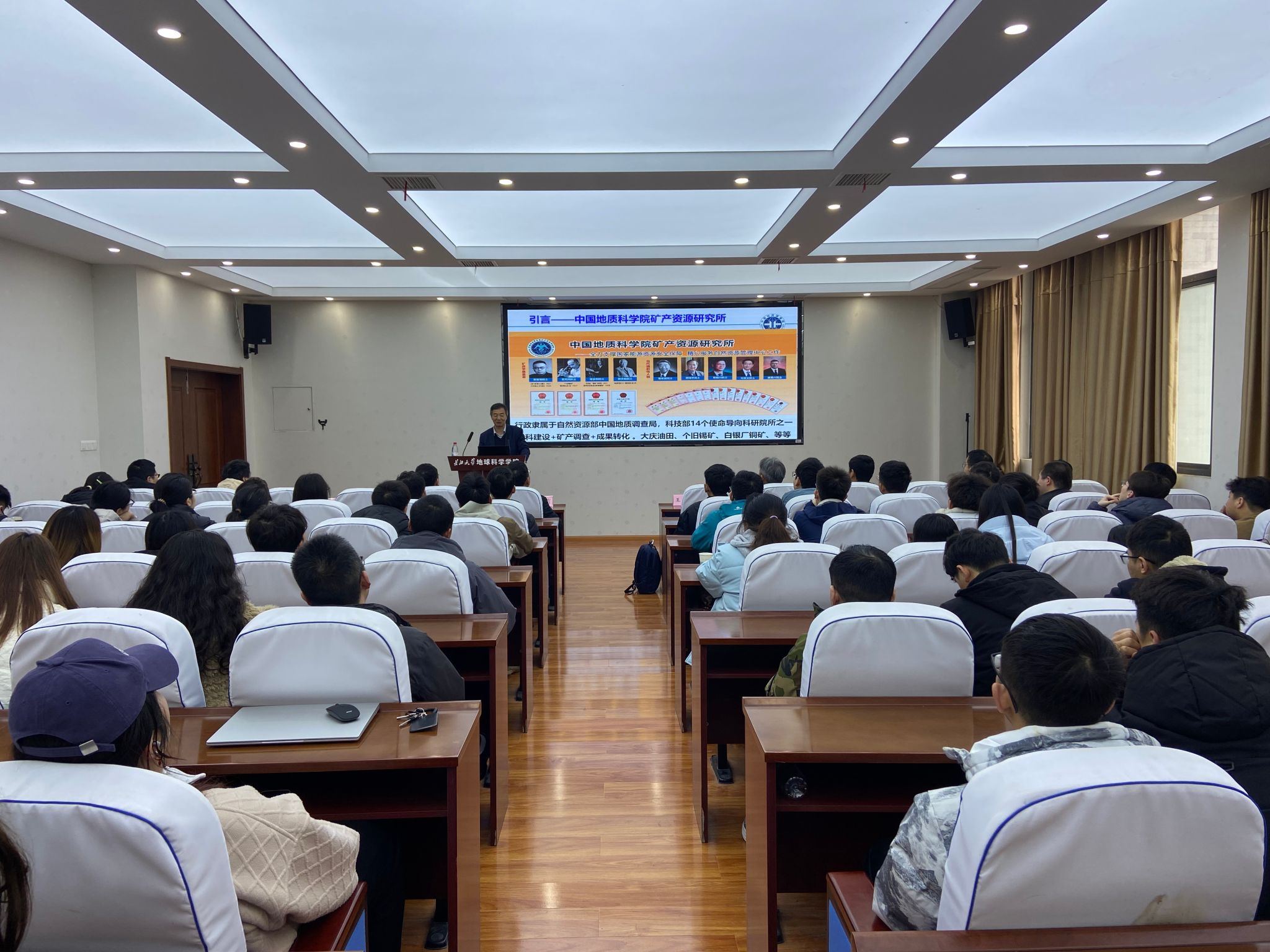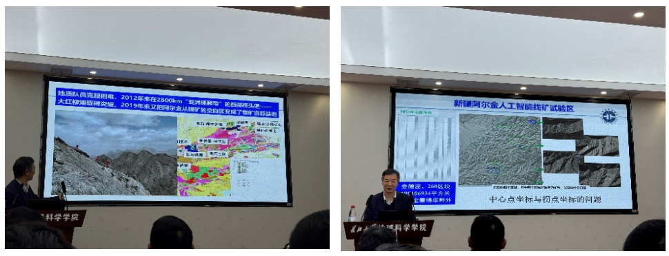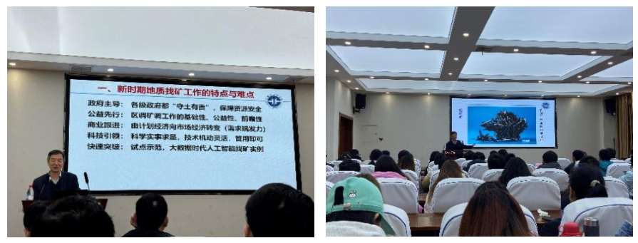 本次报告紧扣《中国矿产地质志》与新一轮找矿行动这一主题,分为“找矿报国,时不我待”和“全位成矿,缺位找矿”两个部分展开。首先介绍了中国地质科公司矿产资源研究所灿烂的历史和伟大的业绩,引来师生阵阵惊叹。