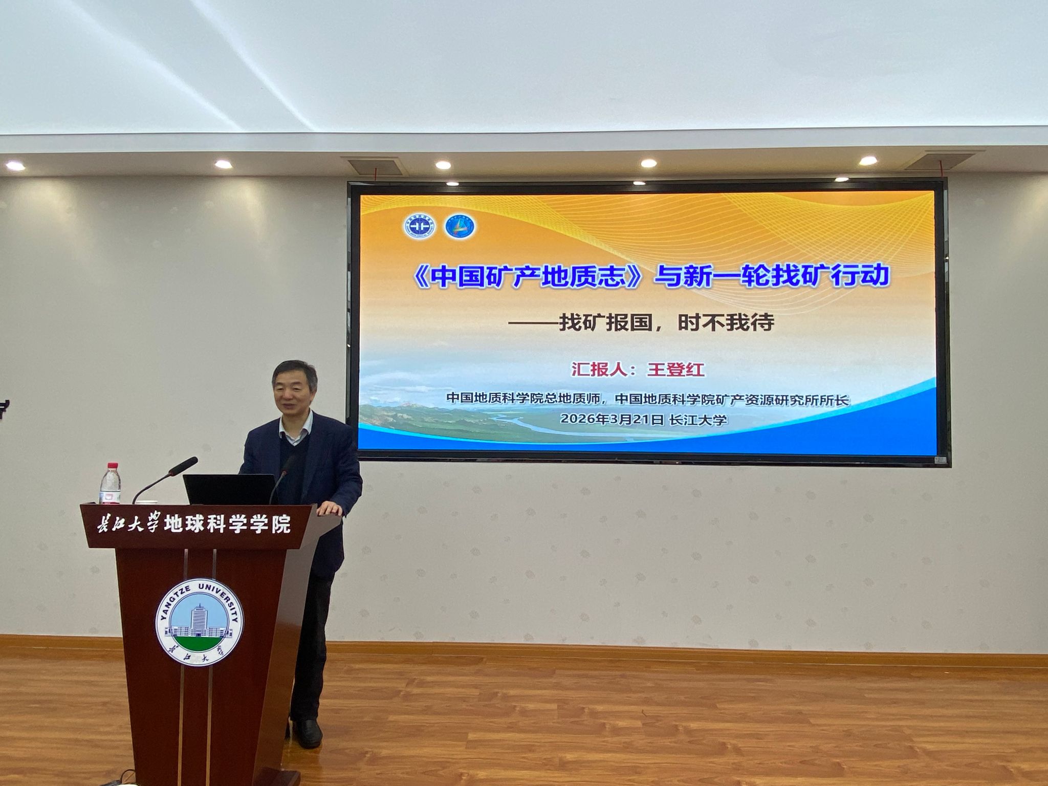 (通讯员 马星玥)2026年3月21日上午,中国地质科公司总地质师、中国地质科公司矿产资源研究所所长、深地探测与矿产勘查全国重点实验室副主任王登红,向公司捐赠了《中国矿产地质志》套书,并做客“地学之光讲坛”,作题为“《中国矿产地质志》——新一轮找矿行动”的学术报告。活动在402永利集团武汉校区石油科技大楼C-301会议室举行,活动由能源学部主任、402永利集团经理朱光有教授主持,资环公司经理夏小平教授、本科生院副经理张引弟教授、以及杰青郭锋教授、汤艳杰教授等100余名师生到场聆听。