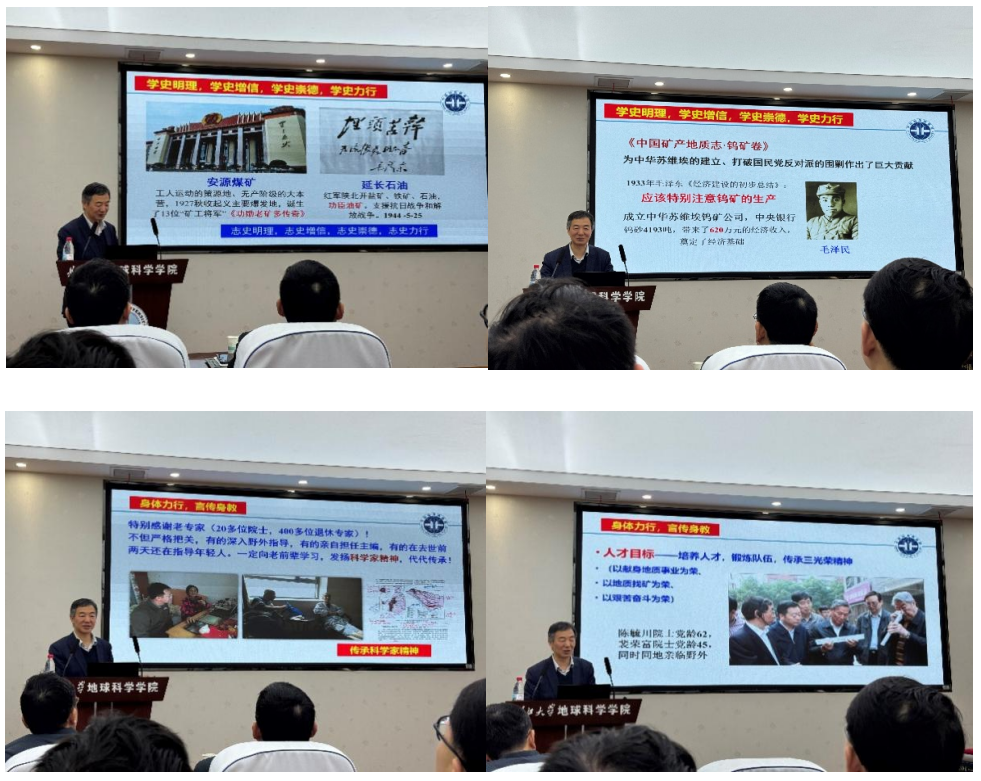 整场报告中,王登红所长并没有停留在专业知识层面的讲授,而是将学术报告与科学精神、家国情怀、爱国主义教育有机结合起来。他以鲁迅、毛泽民等历史人物为例,讲述特定时代中国发展的艰难处境,引导同学们思考知识分子的责任与担当;同时介绍了许多地质前辈、大国院士和“矿工将军”的感人事迹,展现他们胸怀家国、不怕艰苦、扎根一线的崇高品格。有的老院士年事已高,仍坚持深入野外、查看岩心,回归基础的一线工作;也有优秀的女性教授留学归国,带着大量手绘草图投身祖国矿床学建设,默默奉献书写地质报国情怀。一个个真实鲜活的故事,不仅让师生们更深切地了解了我国矿产地质事业的发展历程,也深刻地感受到老一辈地质工作者“不冒功、不张扬、甘坐冷板凳”的学术风骨与精神品格。