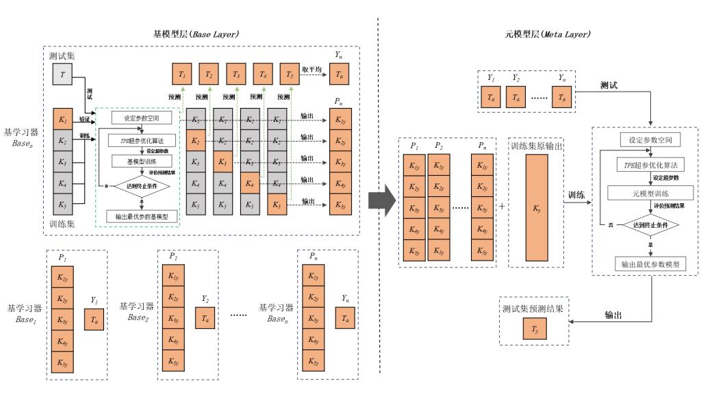 本文基于树结构Parzen估计器(TPE)和两层Stacking集成学习模型,系统研究了其在岩石脆性指数预测中的可行性:TPE作为一种高效的超参数优化算法,能够在复杂参数空间中快速定位最优解,从而提升基学习器的性能;两层Stacking模型能捕捉不同算法对数据特征的敏感性和差异性,对前一层的输出结果进行再学习与优化,从而降低单一模型所带来的偏差与方差问题(图2)。