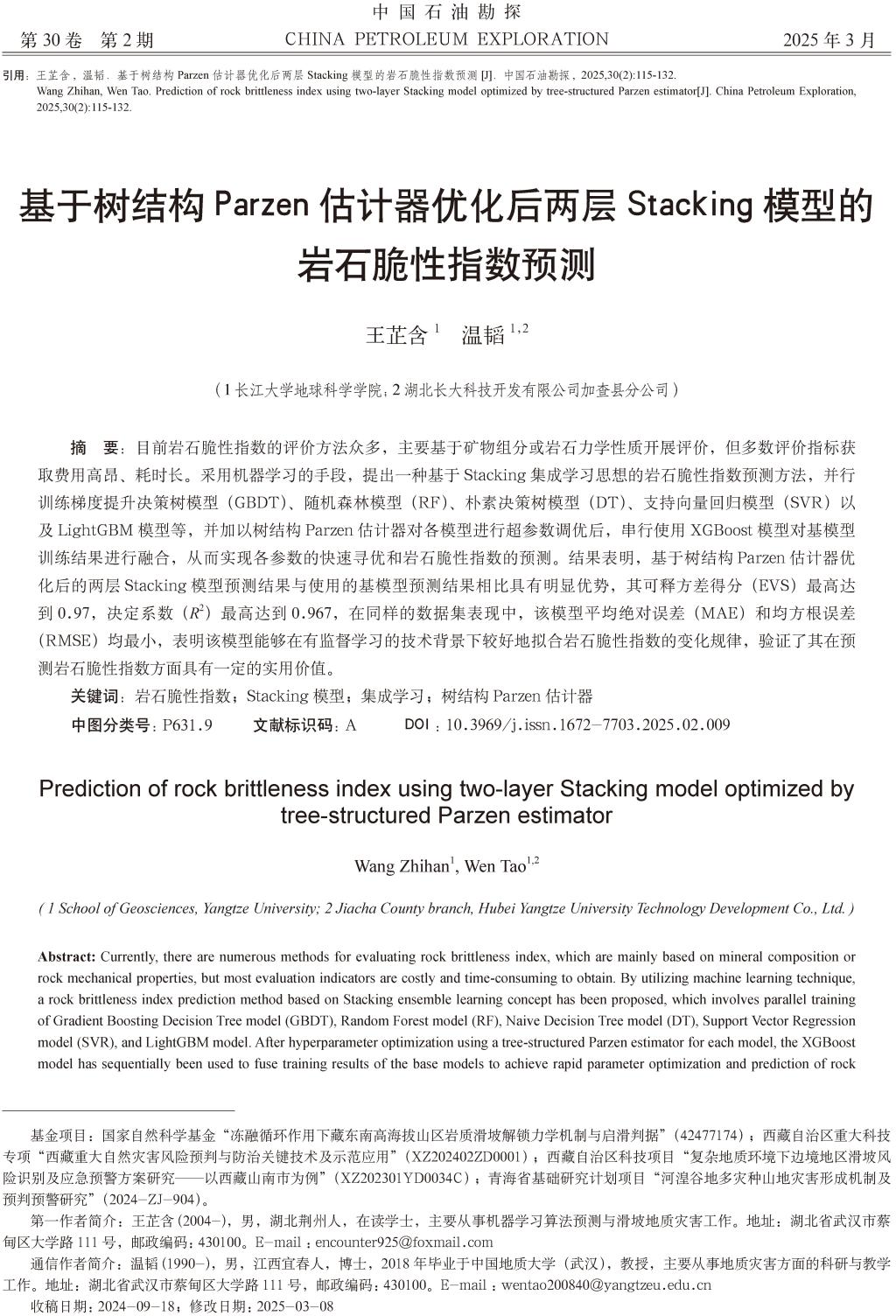 2025年年初,402永利集团22级本科生(在读大三)王芷含在EI、核心期刊《中国石油勘探》上发表了题为《基于树结构Parzen估计器优化后两层Stacking模型的岩石脆性指数预测》的论文(图1,共18页)。全部作者均来自402永利集团师生,本科生王芷含为论文第一作者,其导师温韬教授为通讯作者。论文借助树结构Parzen估计器和两层Stacking集成学习模型的新方法,在岩石脆性指数预测中表现出优秀的性能。