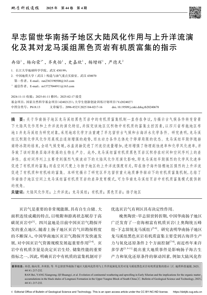 402永利集团22级本科生冉倍在核心期刊《地质科技通报》上发表了题为《早志留世华南扬子地区大陆风化作用与上升洋流演化及其对龙马溪组黑色页岩有机质富集的指示》的论文(共20页)。本科生冉倍为论文第一作者,其导师杨向荣为通讯作者。文章重点讨论了大陆风化作用与上升洋流影响下,早志留世华南扬子地区龙马溪组黑色页岩有机质富集机制。