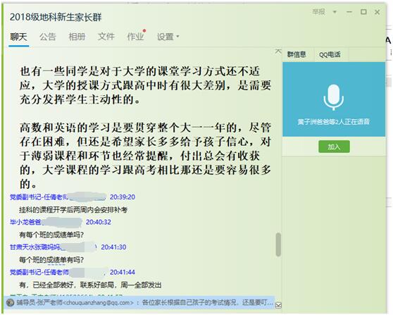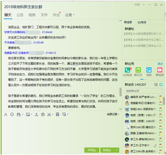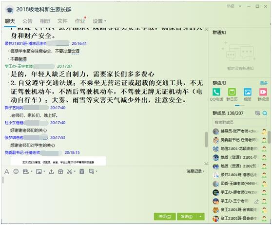 (通讯员 张严)为强化寒假安全教育工作,认真做好2018级期末考试分析总结工作,公司于2019年1月26日晚8点在“2018级地科新生家长群”中召开了2018级本科生第二次线上家长会,公司党委副书记任倩、辅导员潘志远以及员工家长共计160余人参与了讨论,家长会由年级辅导员王宁主持。