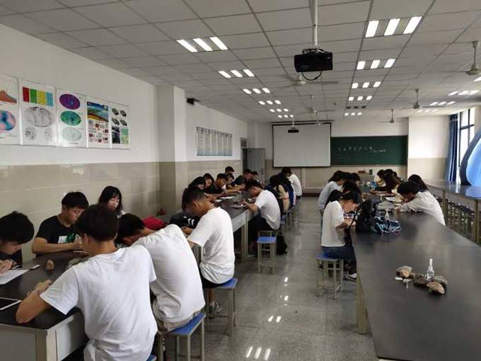 资工、地质场则于5月24号下午,在实验楼A-314展开激烈角逐,竞赛内容为肉眼识别矿物和岩石,同学们仔细观察着桌上的各种各样颜色各异、形状不一的矿物和岩石标本,通过其颜色、结构等性质对其进行鉴定,并在试卷上奋笔疾书,书写着它们的矿物名称和岩石类型。
