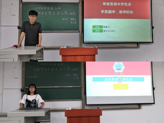 在地质专场上,首先是来自资工21504班的单鹏飞学长,他先介绍了他的老员工活,还展示了班级的自制毕业视频,接着从理论学习、学术研究和工作生活等方面分别讲述。在学习方面,他叮嘱大家一定要珍惜实习和在实验室的机会,认真对待每一门考试,通过四六级,并积极培养兴趣爱好,做到全面发展;在工作方面,要积极参加各种社团活动,一丝不苟完成手头的工作;在人际交往方面,要处理好与同学和室友的关系。来自地质21502班的吴兰军先和大家分享了自己的日常学习和专业课学习,她说到高数和英语是两门非常重要的学科,希望大家能学好这两门学科并且一定要培养自己的对专业的兴趣,全力学好专业课。接着分享了她的学干经历,在院会和各大校级组织内,主要负责网上新闻撰写、官Q运行等工作,以此激励大家认真学习,认真工作。