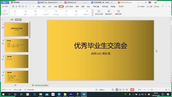31日晚7点,首先向大家交流分享的是来自地信21601班的柯莹同学,她分别从学习方面、学干方面、课外实践方面跟同学们交流分享。学习上,她介绍了英语四六级的重要性和自己的备考方法;同时也告诫学弟学妹们要认真对待专业课,最后还分享了一短话:“去做你想做的事吧,不会有比现在更好的时机了。”在柯莹同学介绍完后,由来自地信(产业)21601班的李鹏同学跟大家分享交流,他先进行了简单的自我介绍,紧接着分享了自己大学期间的学习生活等,主要向大家交流了自己在考研过程中遇到的困难和解决方法,他认为考研相当于两个战场,一个是信息收集战,一个是精力持久战,最后他还给同学们提出了三个建议:一是以学习为主,学干为辅;二是多交朋友;三是认识自己,合理规划。最后,是由来自地信21602班的卜明伟同学与大家分享交流。关于大学学习,他在分享经验的基础上,还详细介绍了公司每年课程学习的重点,同时告诫大家不要挂科,因为一旦挂科可能会错失很多机会。最后,卜明伟將大学总结为“认真、刻苦、谦逊”三个词,并以一首诗来结束分享。“胸怀鸿鹄之志,必展骐骥之跃……厚积分秒之功,定将一鸣惊人。”