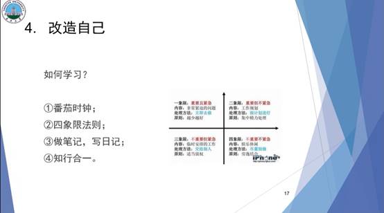 30日晚7点,樊柯廷、李康、王明敏3名同学分别进行学习经验分享。首先为我们做分享的是樊柯廷。他从自己的实践经历告诉我们,想做好一件事,你必须要有积极的态度,紧接着他又说“大学可以偷空休息,但不能一直休息,因为大学的意义不仅仅局限于宿舍。”最后,他告诉同学们,“大一实践打基础,大二实践造砖瓦,大三实践顶梁柱。”你可以通过一些企业实习,明白你更适合于什么岗位。紧接着,为我们做分享的是李康。他谈到老员工活要有明确的目标,目标就像你深夜航海时的灯塔。同时也认为大学并不是高中老师所讲的那样绝对自由。在大学,你必须学会自律,才能使得你的目标更加坚定。最后便是要务实,拒绝虚假,在实践中不断探索,这样才能更加深刻地去了解任何一件事。最后是王明敏为同学们分享经验。她先从自己方法讲起,她表示自己每天都会把要做的事列一张表格,这样就可以均衡地分配时间。同样地,态度也决定着你能否做好一件事,当你有求真务实的态度,就没有什么事能够难倒你。