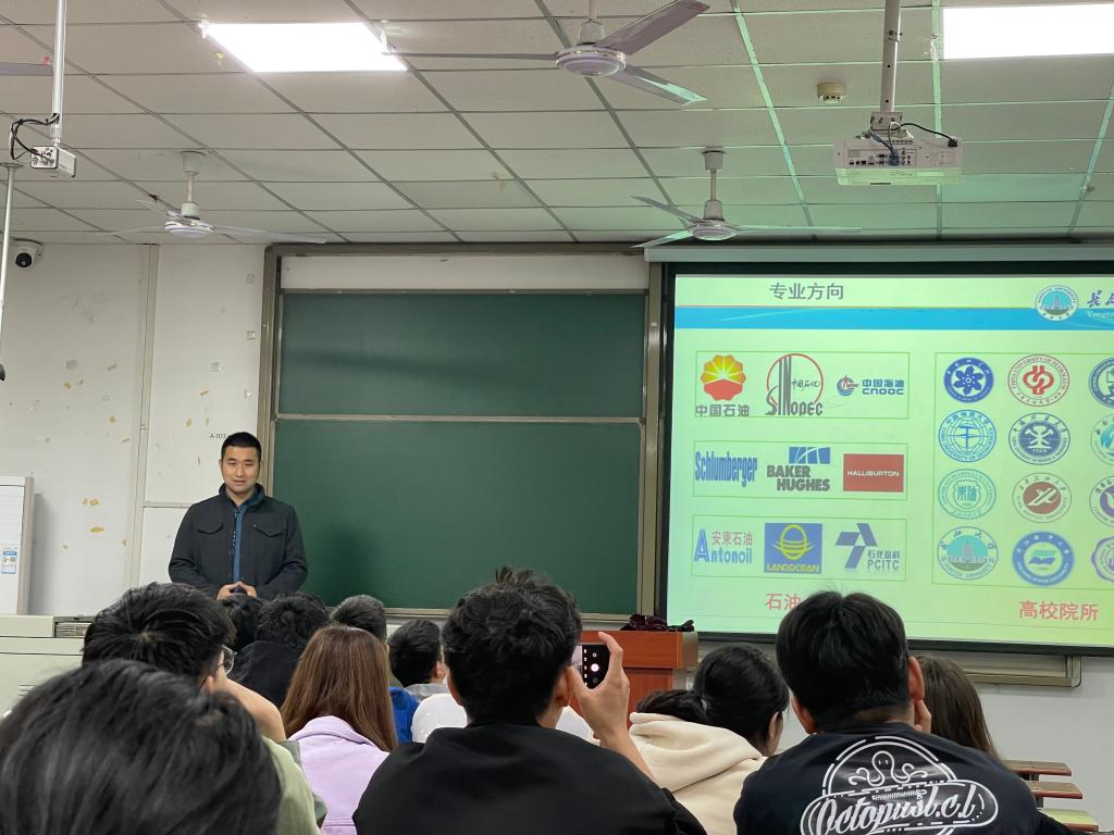 地质学专业分享人林伟老师主要从个人学习及科研经历、行业前景、心得体会三个方面为同学们开讲。林老师建议大家多关注页岩油气等行业前沿领域,为将来做研究及就业做准备,还分享了自己在博士期间赴美国加州大学伯克利分校时的所见所闻,并告诫同学们要明确方向、制定计划、合理安排时间。“没有专注力的人生就仿佛大睁着双眼却什么也看不见,专注力很重要,用心做一件事才可以得到回报,坚守自己的初心,要下的了苦功夫,实实在在做事。”