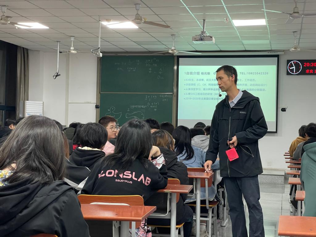 地信专业邀请到了杨元维老师为同学们进行交流分享。杨老师生动幽默的语言和渊博的学识一下子就吸引住了大家的注意力。简单的自我介绍后,杨老师围绕“地信专业的特点及前景”这一主题为同学们进行详细讲解。随后,杨元维老师分享了自己的求学与工作经历,提醒并鼓励同学们学习要高效。最后,杨元维老师与同学们进行了交流互动,在学习、生活等方面为同学们一一指点迷津。