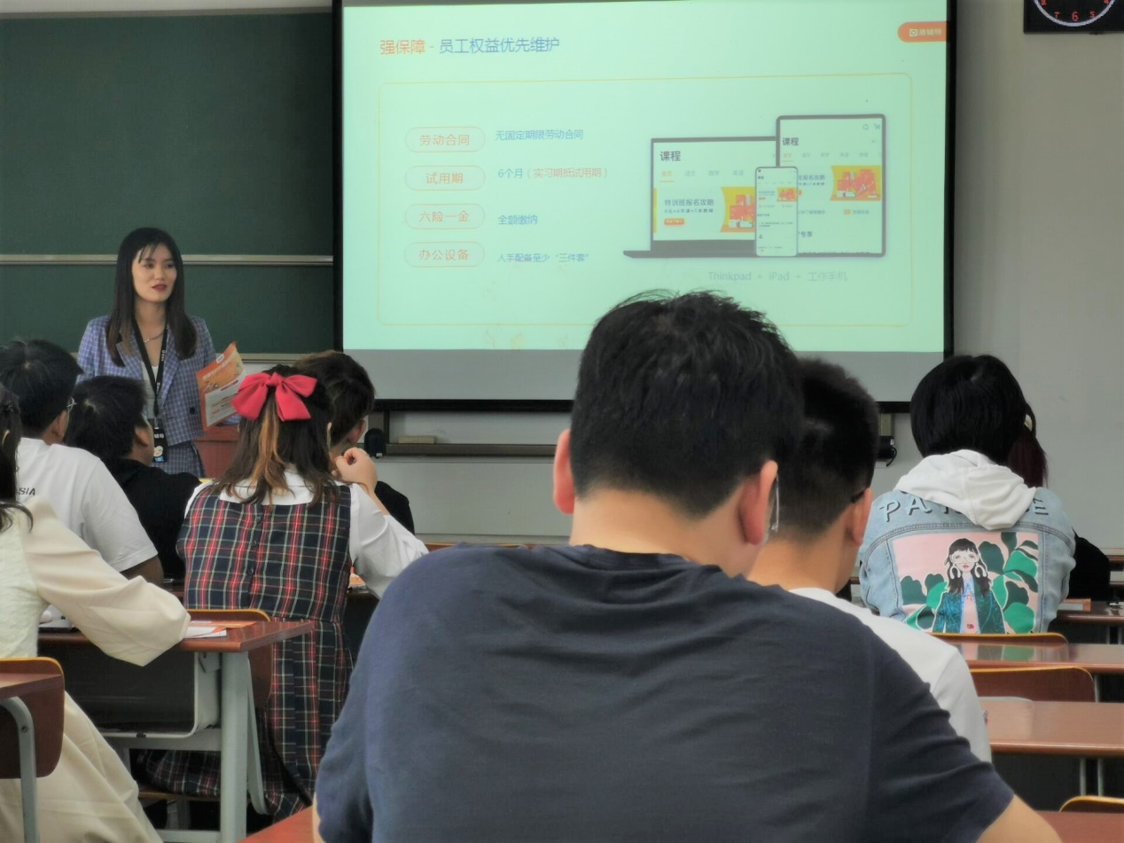 会上,来自猿辅导公司的张老师从公司规模、发展前景、薪资待遇等多方面进行讲解。首先,她介绍了公司的规模,猿辅导是当前网课用户规模最大的公司,全国累计用户破四亿。作为全国规模最大的在线教育公司,旗下有小猿搜题、猿辅导、斑马AI课等多款教育APP。同时,猿辅导已在国家级高新区—中国光谷投资建设猿辅导产业园。这些充分体现猿辅导的实力雄厚,资金充足,并且有着巨大的发展前景。
