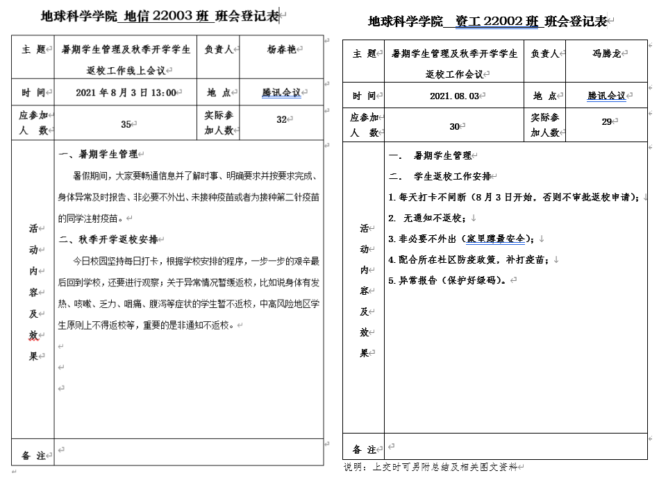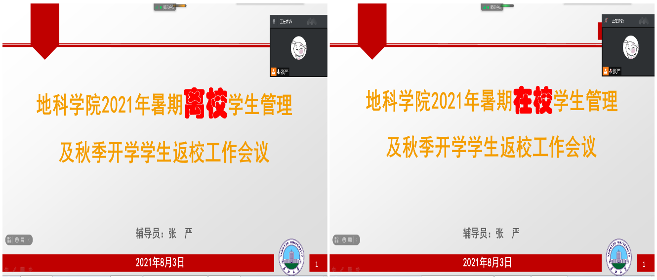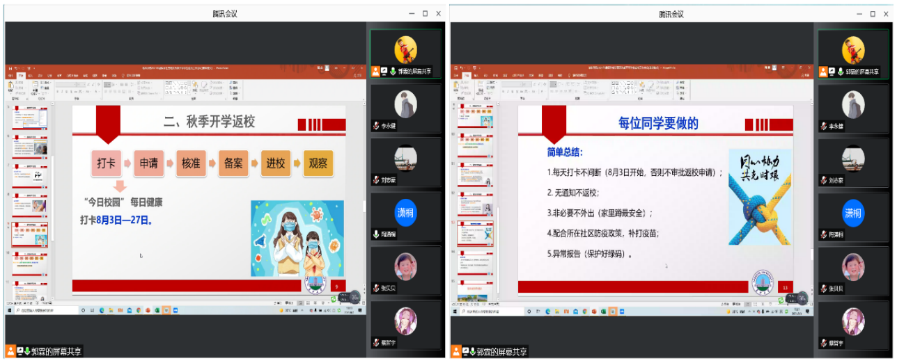各年级辅导员按“校内”与“校外”两类员工分组组织召开主题班会。会议内容主要包括暑假员工管理和秋季开学返校安排两方面,重点介绍了当前愈发严重的疫情防控形势,要求同学们在暑假期间保持信息的畅通、明确公司的相关要求、非必要不外出并出现问题及时报告,最后要求积极注射疫苗;接下来对返校的6个步骤逐一进行讲解,特别是对“打卡”和“申请”环节的“每天坚持打卡、提交行程绿码和健康绿码、填写返校行程”等重难点工作进行了仔细说明。