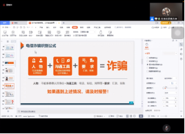 艺传公司肖淳老师就网络、反诈与国家公共安全教育这一主题进行分享。肖老师讲到武汉校区今年已经发生22起诈骗案件,其中有不少是同学们在之前的专题讲座中听过的“常见的诈骗手段”。她提到当一个人放松警惕时,就给了骗子可乘之机,提醒大家务必高度重视、认真完成每周反诈测试,保护个人财产安全。