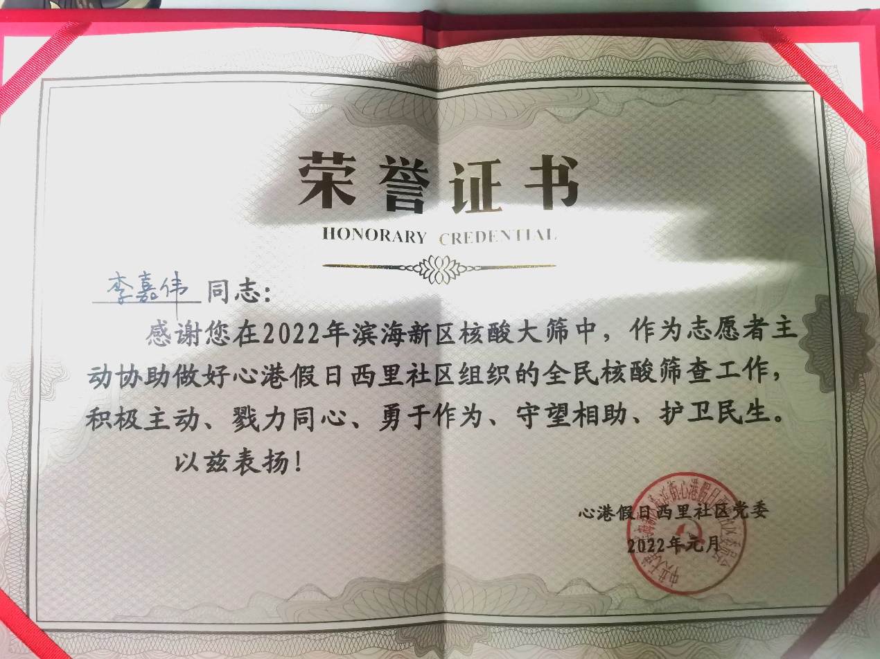 图一 社区党委给予李嘉伟同学的荣誉证书