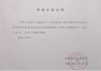 2022年1月,奥密克戎变异株悄无声息地登陆天津并迅速扩散,地信22102班的王靖杰带着必胜的信念加入到抗疫志愿者的队伍中。在两次全员大筛查中,从疏导人员到试剂传递员,不管上级分配什么任务,他都会竭尽全力做好。因出色表现,受到社区表彰。