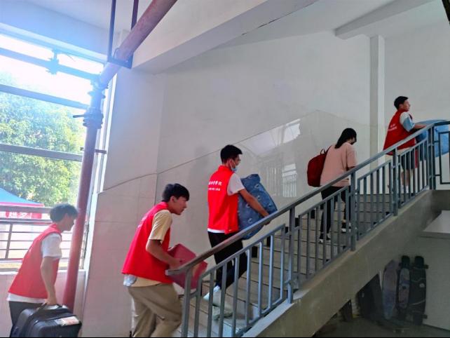 通过前期安排,新生到达公司迎新点后,按报到流程,进行行李消杀、身份核查、领取通行证及校园卡、登记信息、然后在志愿者的协助下搬运行李,到宿舍办理入住。
