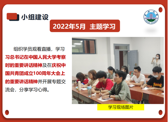 2021年12月,小组开展了两场理论学习培训,成员综合素质和团队凝聚力显著提高。今年1至3月,小组成员通过前往红色革命基地,结合十九届六中全会精神,进行党史研学,并开展了以“紧跟时代浪潮,赓续红色血脉”为主题的线下汇报与评比。为了传递研学成果,学员们在本班班团会上做了主题宣讲,受到广泛好评。本活动还受到省级媒体的关注。今年5月,学员集中观看直播,学习了习近平总书记在中国人民大学考察和建团百年重要讲话精神,并开展专题交流会,分享学习心得。今年7至9月,小组开展“学习旧足迹,奋进新征程”暑期实践活动,通过走访、查阅资料等方式,对党的十八大以来习近平总书记重要工作足迹进行学习,并制作学习视频,在公司新媒体平台进行展示。