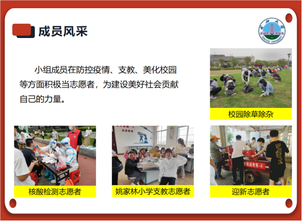 作为新时代优秀青年,小组成员积极投身志愿服务,实现了由“学”到“践”的转变。同学们争当抗疫志愿者和迎新志愿者,主动参加姚家林小学支教等志愿工作……活力与爱心,用汗水来体现;责任与担当,用行动来证明。