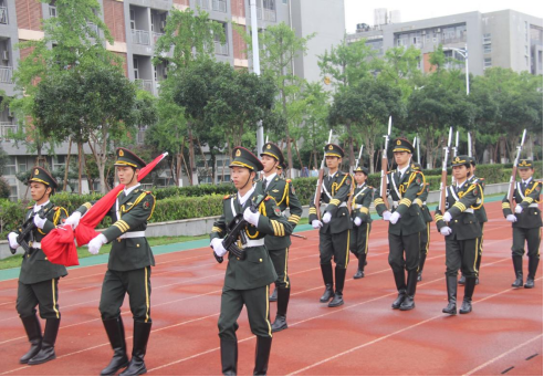 第二项,由国旗护卫队进行升旗仪式,队员们步伐坚定,身姿挺拔,五星红旗伴随着《义勇军进行曲》的奏响徐徐升起,全场肃穆,向国旗行注目礼,全体师生心中饱含对祖国深沉的爱意。