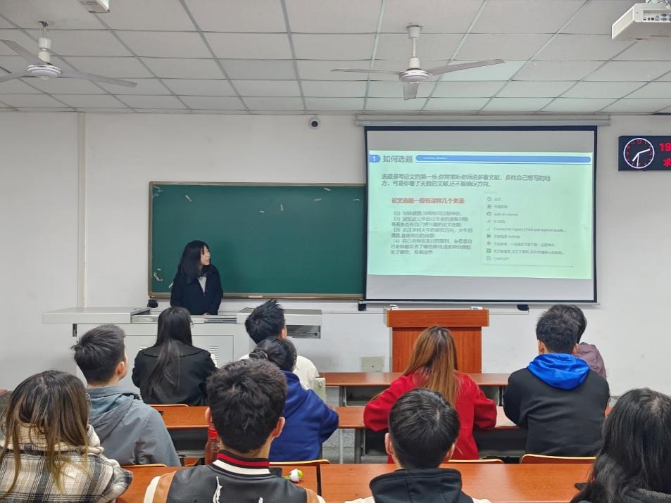 瞿佳同学在分享中强调了确定研究方向的重要性,并建议同学们通过阅读文献综述,深入了解该领域的前沿问题。她还鼓励同学们要制定清晰的写作计划,做好时间安排,以确保高效地完成论文撰写。她强调,明确方向,并广泛搜集相关支撑材料,对于论文的整体质量至关重要。