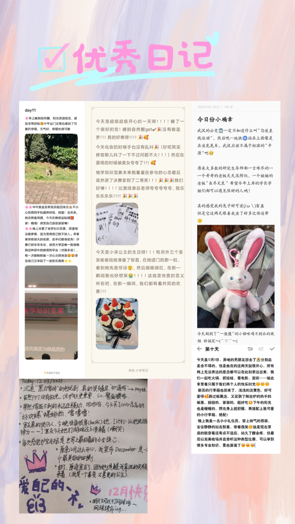 员工会心育部成员通过在活动前入班宣讲,吸引同学了解和参与。百余名同学每天通过QQ群的打卡链接,积极分享身边有爱的同伴、暖心的事物、感动的时刻。例如地信22302班文木燕同学在 11 月 28 日的感恩日记中写到“今天是小宋公主的生日!和另外三个室友偷偷给她准备了惊喜,在她进门的那一刻。看到她先是惊讶,然后眼眶微红,在那一瞬间我也好想哭,这就是惊喜的意义!”令人心里一暖。每晚心育部负责人提醒、完成收集后,会选出优秀日记,并于次日公布名单并制成电子海报分享在QQ群,鼓励同学们继续努力“晒幸福”。