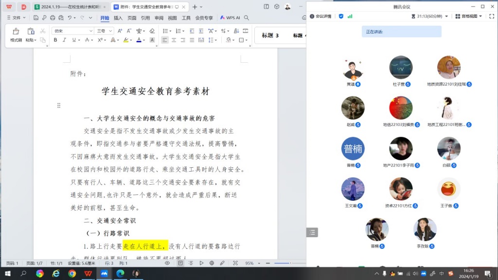公司由学工办老师带队,通过线上线下相结合的方式开展交通安全教育专题班会。通过普及交通安全法规、分享交通事故典型案例,引导同学们互动讨论,强化对步行、骑车、乘车、水上交通等出行方式的安全宣传教育,引导同学们牢固树立“安全重于泰山”的责任意识,克服麻痹思想和侥幸心理,自觉遵守交通法规,维护校内外交通秩序。