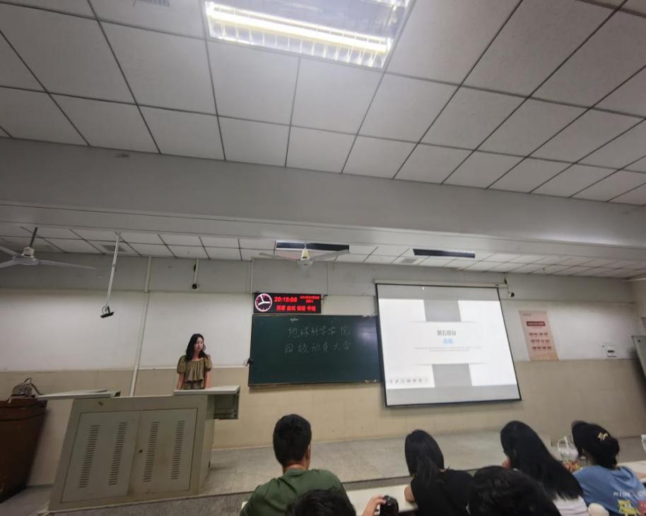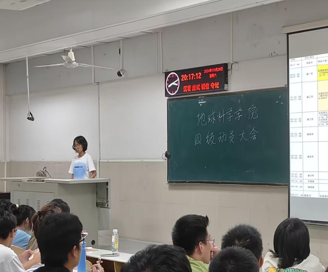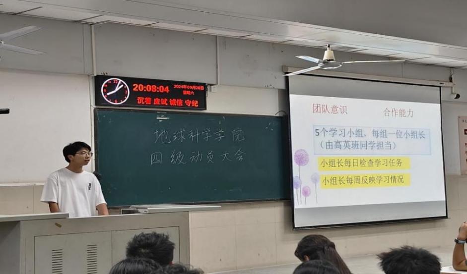 随后,学委代表资工12401唐磊,资工12404张紫仪,地信12402吴睿,地质12401吴天伊依次上台,全面展示了各班精心制定的英语四级学习计划。这些计划从学习小组的组建、学习计划的安排到学习阶段的检测等方面都进行了细致的规划。班级学习计划包括成立学习小组,通过成员之间的互相督促,实现共同进步,小组成员可以定期交流学习心得、分享学习资源,营造出浓厚的学习氛围;制定详细的学习时间表,合理安排每天的学习任务。从清晨的晨读练习到晚间的复习巩固,每个时间段都有明确的学习目标,确保学习的系统性和连贯性;定期进行学习阶段检测,通过模拟考试、小测验等方式及时发现问题,并在老师和同学的帮助下加以解决。