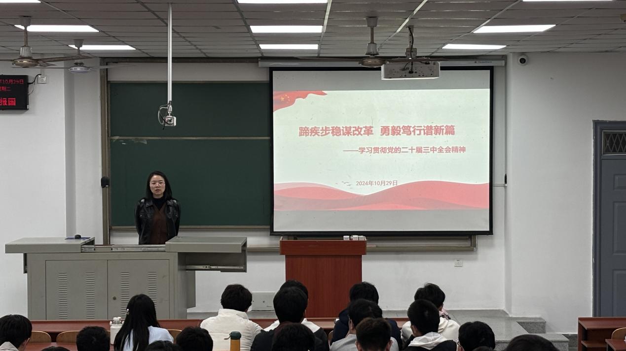 随后,郭老师围绕党的二十届三中全会的主题由来、做出的部署以及展现的创新三个方面,对全会精神进行了系统深入的解读。她通过生动的阐述、具体的案例和详实的数据,使在座同学对全会精神有了更深刻的理解和认识。郭老师还特别提到,面对纷繁复杂的国际国内形势、新一轮科技革命和产业变革以及人民群众的新期待,我们必须自觉把改革摆在更加突出的位置,紧紧围绕推进中国式现代化进一步全面深化改革。