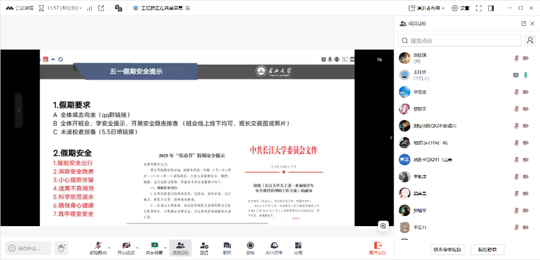 各班主任结合公司发布的《2025年“五一”劳动节假期安全提示》以及《中华人民共和国反有组织犯罪法》,从安全出行、安全隐患、提防诈骗、不良网贷、防范溺水、身心健康、寝室安全、国家安全意识七个方面展开,帮助同学们树立安全责任意识,提升员工安全素养,用典型事故案例警示员工们,引导员工们进一步增强安全意识和法治观念,牢固树立正确的人生观、价值观。