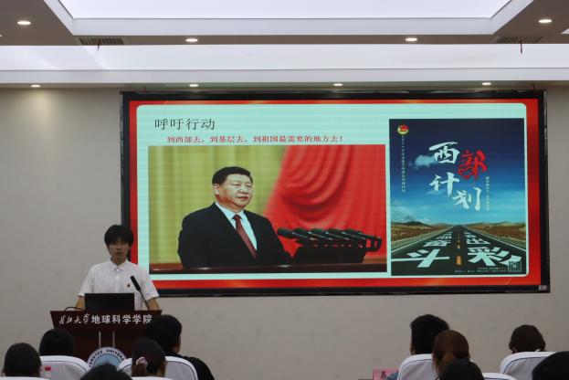 在主题分享环节,来自新疆的马英俊杰同学结合家乡的发展现状,阐述了边疆建设的时代意义。他表示,作为地信学子,他将努力学习专业知识,毕业后回到家乡,为家乡的发展贡献青春力量。随后,薛心怡同学系统解读了西部计划政策,围绕“政策支持与保障、服务地选择与岗位、整体报考流程、备考策略”四个方面展开。她认为西部计划不仅是志愿服务,更是青年将个人理想融入国家战略的关键通道。