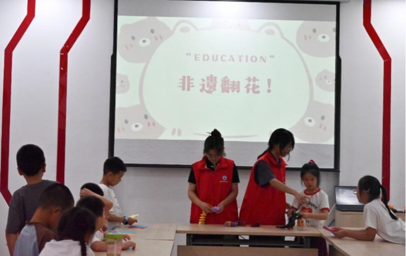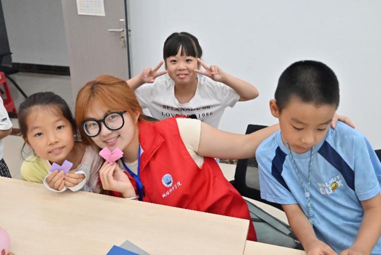 “这里要对齐边角,折的时候用力均匀一点……”志愿者们穿梭在孩子间,针对大家遇到的难点逐一解答。小朋友们专注地跟着步骤操作,时不时举着半成品向老师请教。