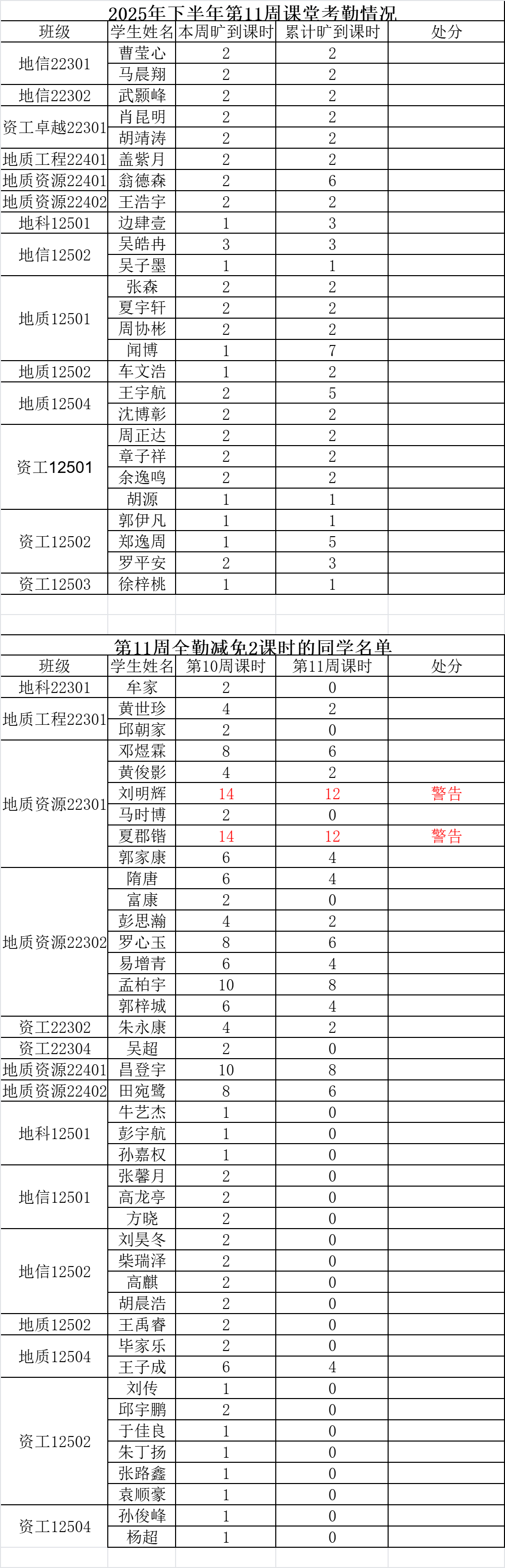 关于第十一周课堂考勤的通报