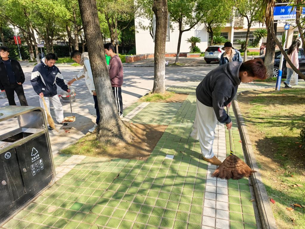 活动以班级为单位依次轮值。在公司专兼职辅导员带领下,同学们分工协作,对责任路段进行全面清洁,清扫路面垃圾、将电动车摆放整齐,使校园环境焕然一新。