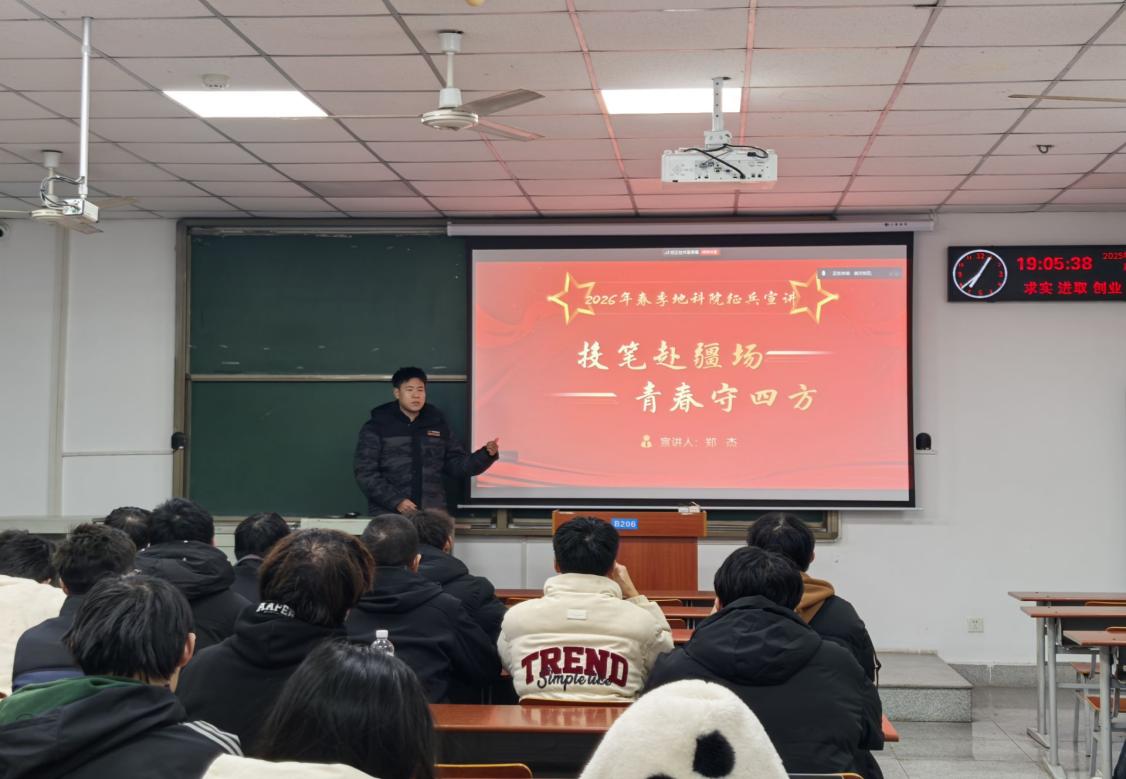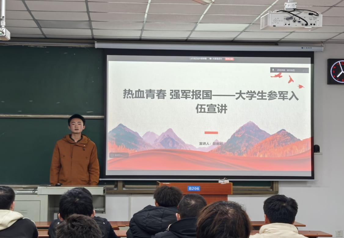 (通讯员 黄瑱 邢佰诗 李雨泽/摄)为深入贯彻落实国家征兵政策,激发在校老员工携笔从戎、报效祖国的热情。12月30日晚19:00,402永利集团2026年春季征兵宣讲会在武教B206以线上线下融合方式举行。会议由退伍士兵地信22401班彭郝毅、资工22304班郑杰担任主讲,辅导员乔宇、黄瑱于武汉和荆州校区同步主持,400余名员工参与活动。