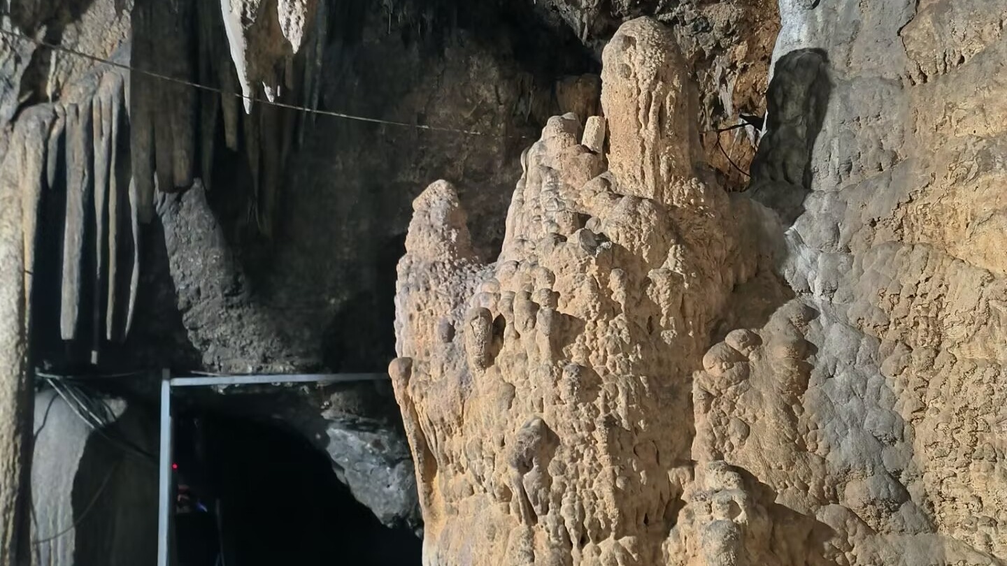 古神洞洞口隐于藤蔓间,进入洞内,头灯光亮照亮了千姿百态的岩溶地貌:洞顶垂落石钟乳,地面升起石笋,部分衔接成粗壮石柱。肖传桃老师说:这些岩溶景观每生长一厘米需上百年,由雨水溶解碳酸钙,经渗流、蒸发、沉淀日积月累形成。指尖触碰冰凉湿润的石柱,听着洞内滴答的水滴声,真切感受到地质时间的漫长与厚重,心生敬畏。