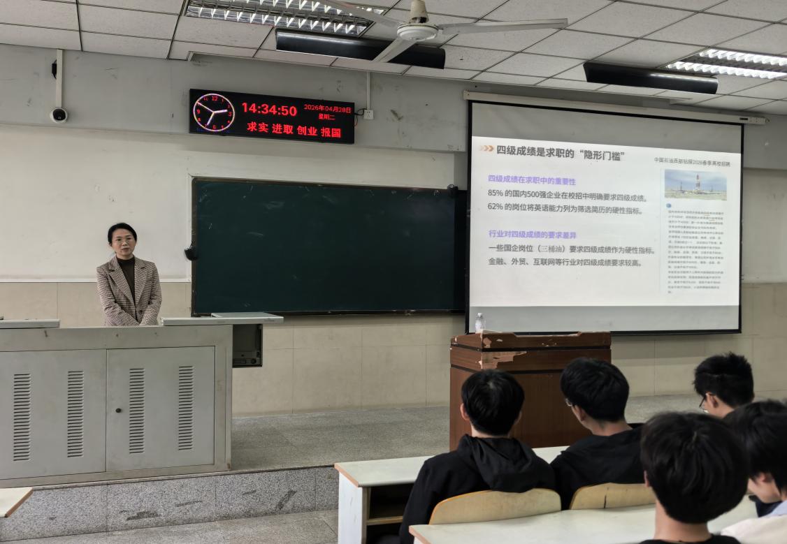 毕浩浩老师围绕《大学英语四级通关策略》为同学们系统讲解备考方法。她首先介绍了四级考试的基本考情与分值分布,帮助同学们清晰把握各板块权重。在词汇提升方面,她强调词汇量是高分基石,并介绍了循环记忆法等高效背词技巧。针对听力这一普遍薄弱环节,毕老师讲解了精听与泛听相结合的训练思路,推荐了实用的备考APP,建议同学们以近5年真题为复习核心,反复刷题、吃透考点。最后,她鼓励同学们:“A journey of a thousand miles begins with a single step,全力以赴,争创佳绩!”