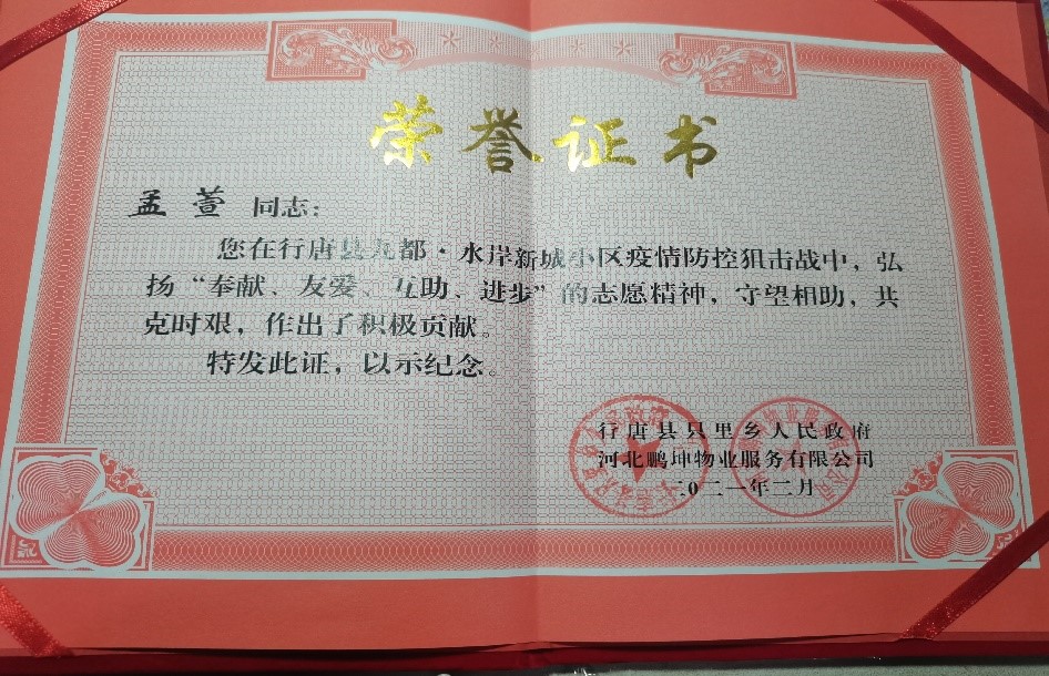 为了有效防控疫情,孟萱奔走在石家庄的大街小巷。在各小区门口张贴通行码、禁止外来车辆和人员入内、对回乡人员进行体温测量、入户信息登记等是她的日常工作内容。孟萱经常白天上门拜访,晚上10点还在社区办公室整理信息,泡面成了她和队友们的主要晚餐。