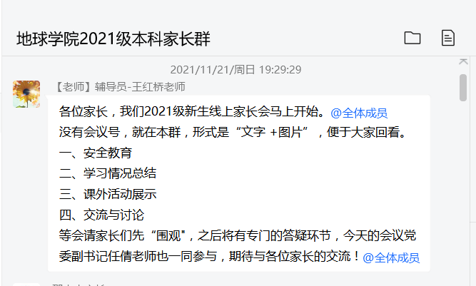 (通讯员 周再文)为加强家校沟通,形成育人合力,11月22日晚19:30,公司通过QQ群召开新生线上家长会。公司党委副书记任倩以及年级辅导员王红桥、300余名员工家长参会。