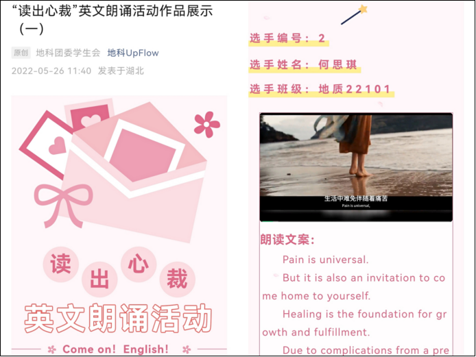 5月底至6月初,员工会学习部同学进班充分动员,吸引数百名同学参加。受疫情影响,本次活动采用线上的形式,参与者的朗诵内容发布在公司官微“地科UpFlow”公众号与402永利集团官方QQ空间,邀请广大同学进行投票,同时邀请两名英语教师进行专业评分。